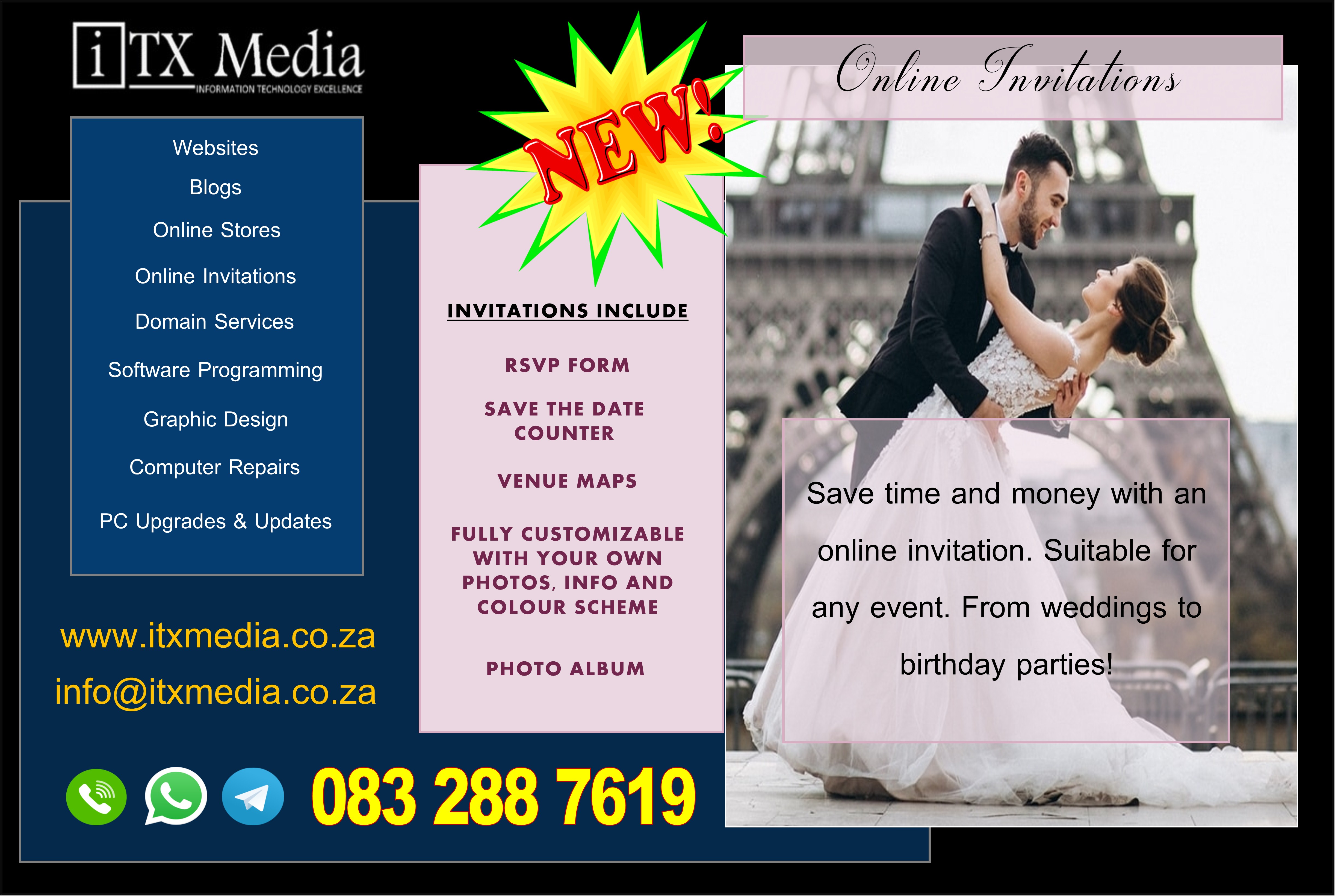 Save Time and money with an online invitation. Suitable for any event. From weddings to birthday parties! You may host your online invitation on your own existing domain or register a new domain. Or alternatively, host your online invitation on our domain at no extra cost.